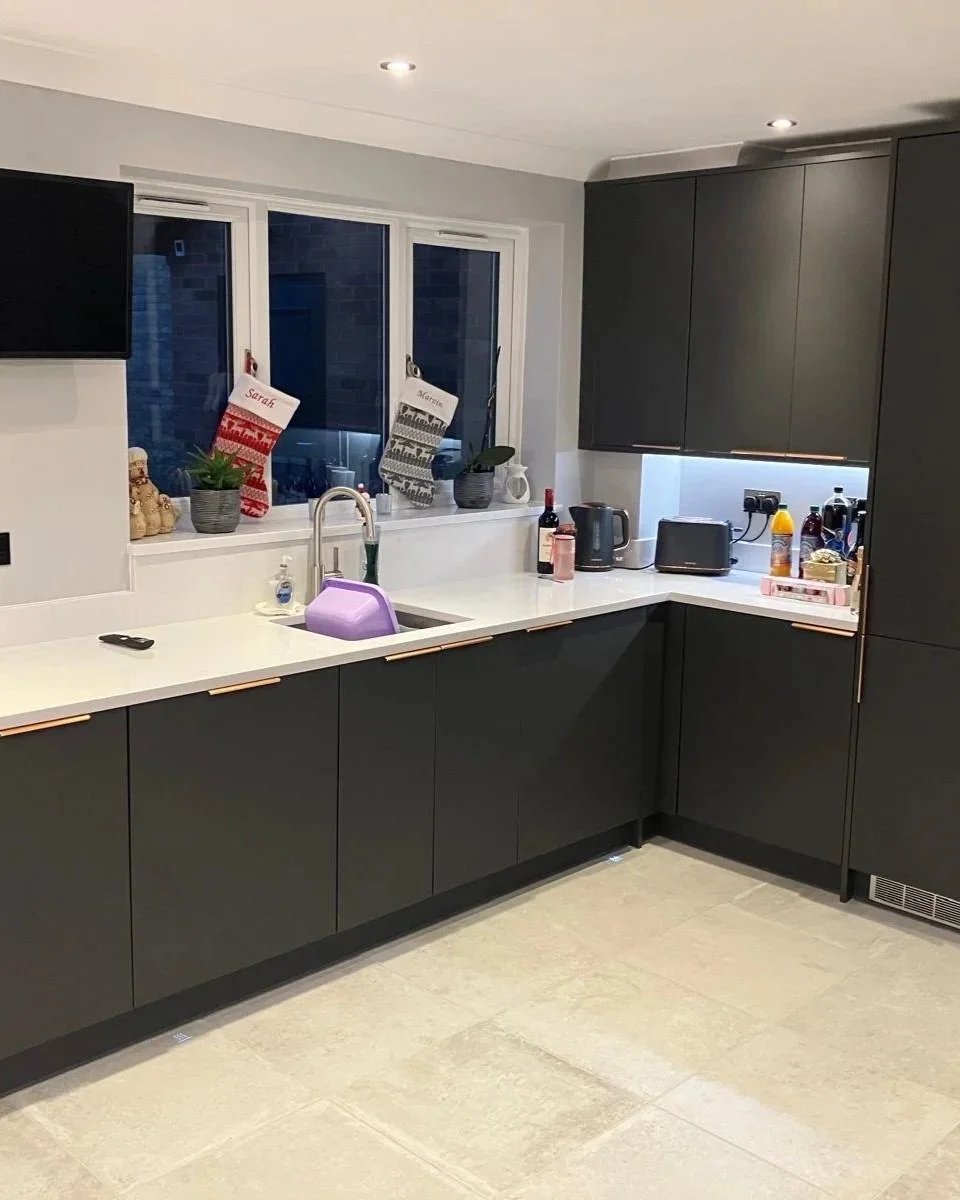 The existing kitchen was removed to make way for a sleek matt black kitchen with an island, stone worktops, and heated tiled flooring.