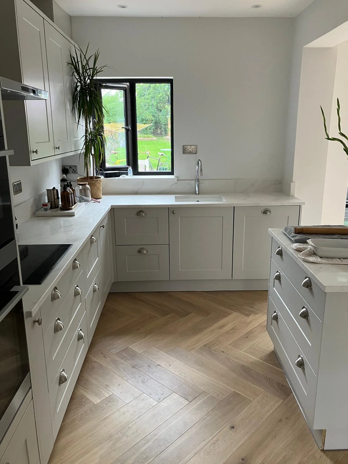 Structural works made way for a beautifully fitted shaker-style kitchen complete with a central island, stone worktops, stone splashback, and a Quooker tap.
