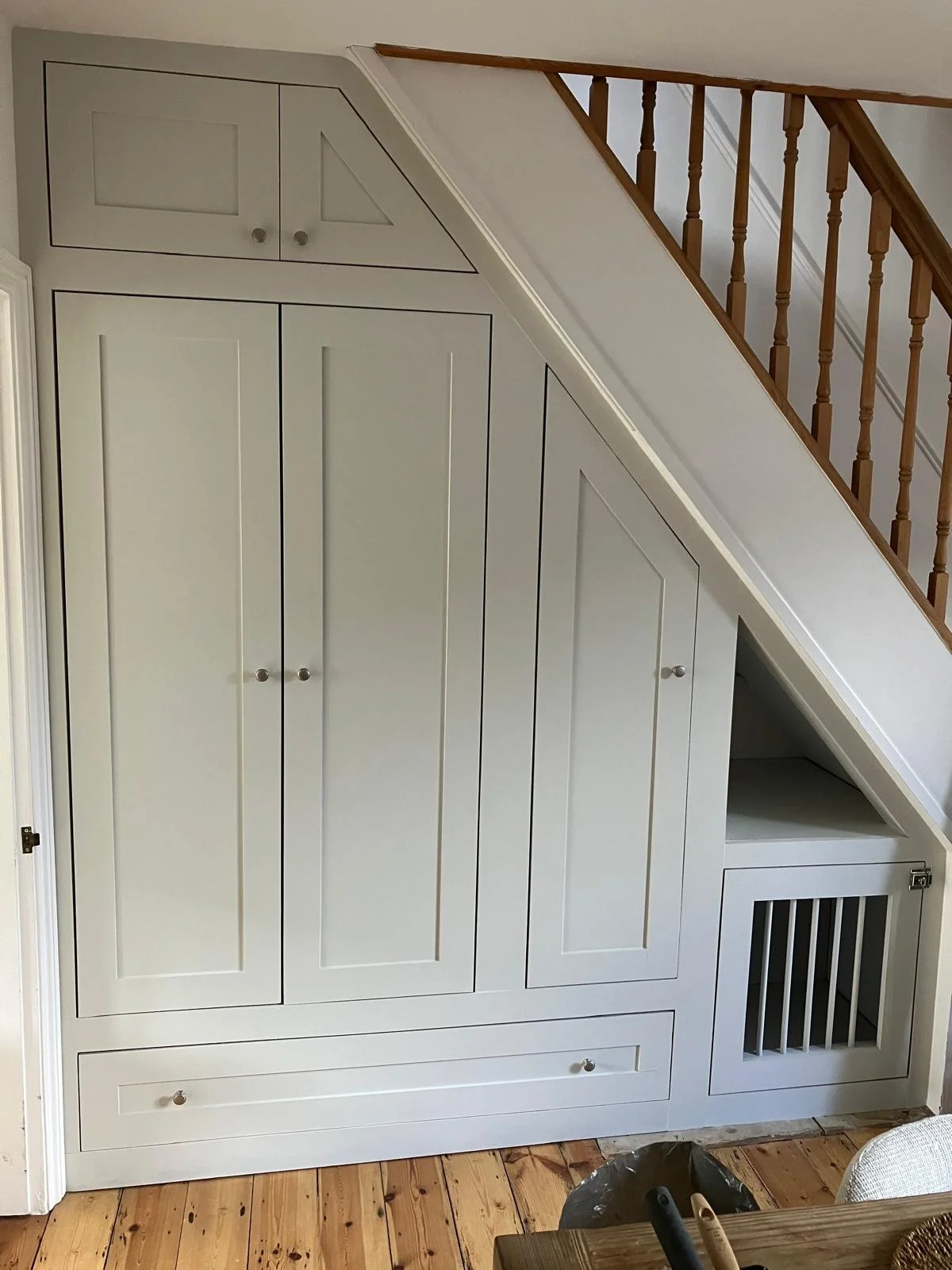 A clever transformation of an unused understairs space into a handy storage solution. Custom-built to include a coat cupboard, shoe drawer, and even a cosy dog "bedroom".
